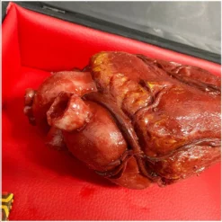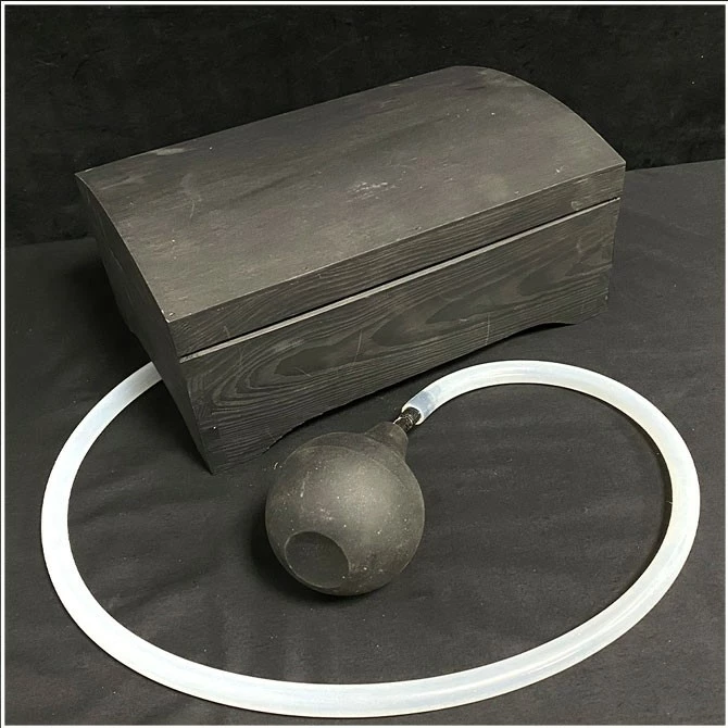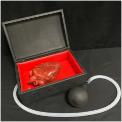 Hyper realistic hand sculpted and painted silicone heart with attached pump. The heart comes in a quality wooden box and a plastic tube runs out of the bottom of the box and attaches to a pump. Just squeeze the pump and the heart beats realistically.