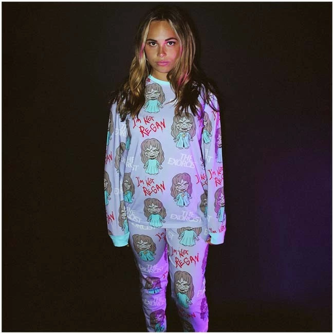 Get out your spirit board and channel your inner demon, if you dare. Featuring a cartoon Regan and the chilling movie logo in an all over print, this new PJ Set is a spooky season must have for cuddling up and watching your favorite horror flicks—horror can be cute right?