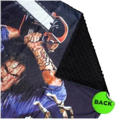 One of the coolest blankets to ever grace a couch, bed, or cabin is this super rad Evil Dead™ Ash Chainsaw Throw Blanket featuring the original poster art from the Turkish release. One might even feel a tinge of guilt being so cozy while Ash is working so hard to merk the undead!