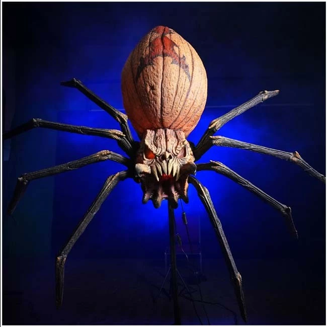 Jack Widow prowls its spooky Halloween pumpkin patch, looking for a victim! This giant spider Halloween prop and jack-o-lantern hybrid is the perfect Halloween decoration for your scary pumpkin patch, Halloween porch, corn maze or haunted attraction. Its body is approx. 3 ft. long from head to tail and the span of its legs are approx. 5 ft. wide depending on how they are posed.