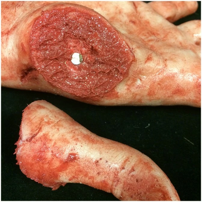 The thumb has magnets in it for easy removal and re-attachment so is perfect for escape rooms. Scarring, blood stain and skin tones may vary as they are hand crafted.