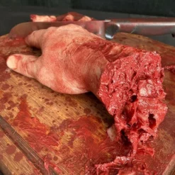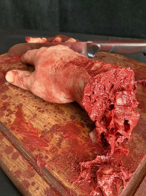 The hand is solid silicone and is mounted on a wooden cutting board. The knife is real, has been ‘dulled down’ and securely fastened to the wood.