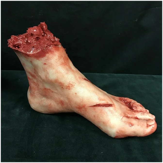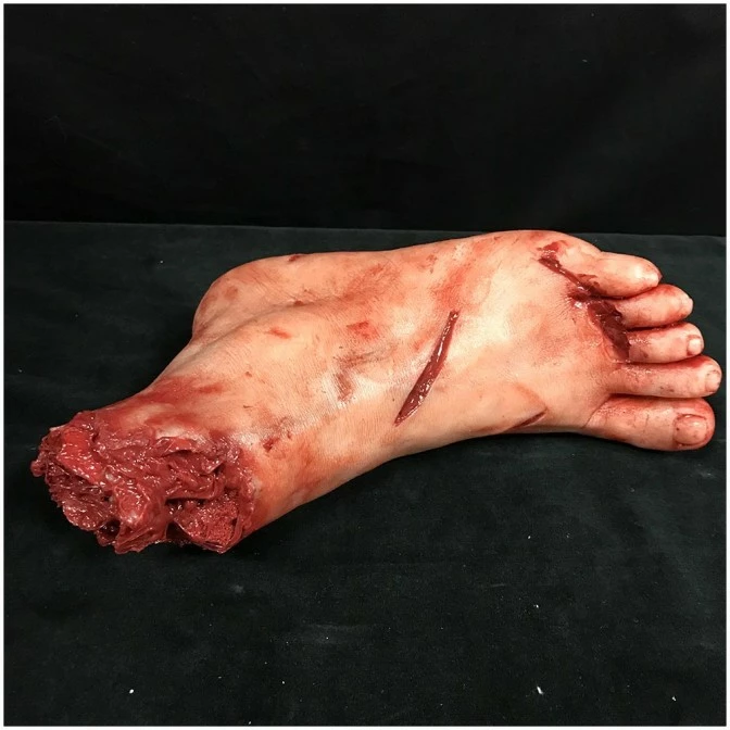 Crafted by a professional US horror artist, this silicone severed female foot is a professional quality prop. With wound detailing.