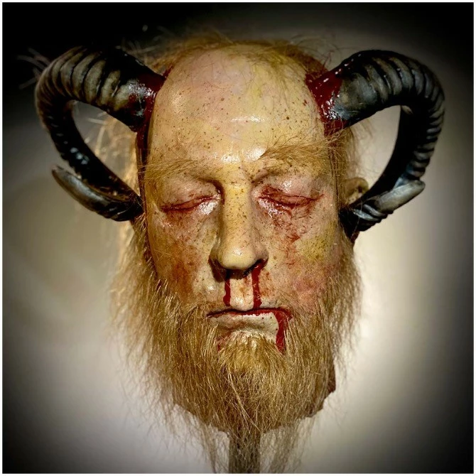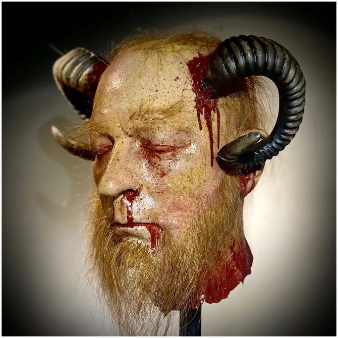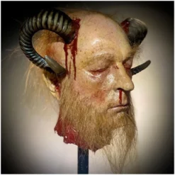 Life cast head with rams horns and hand punched hair, eyebrows and beard. Perfect for Satanic themed scenes.