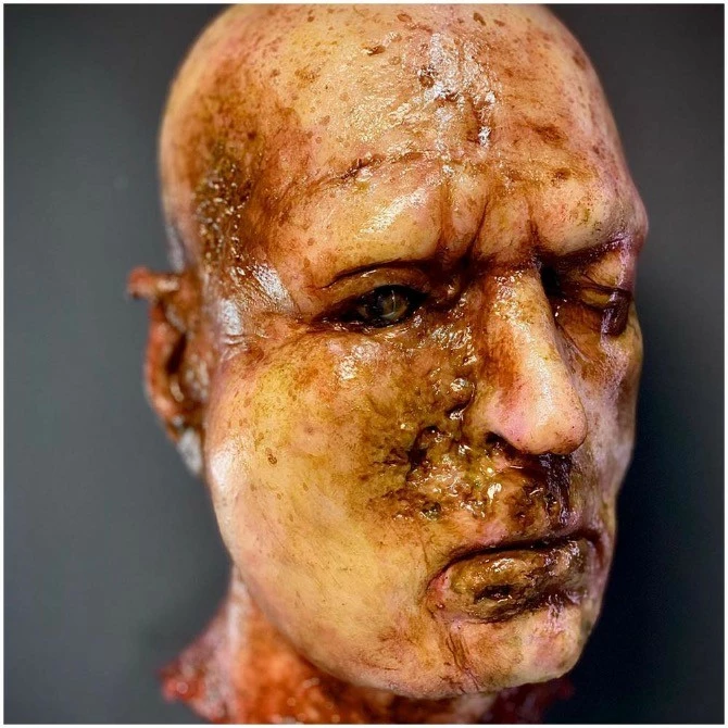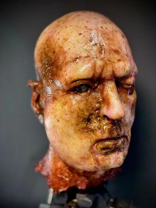 Life cast head in a bloated finish with acrylic eye. Hand punched hair.