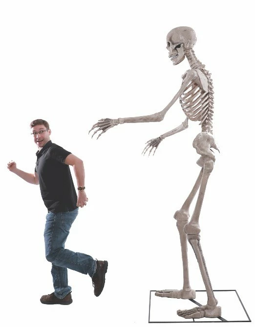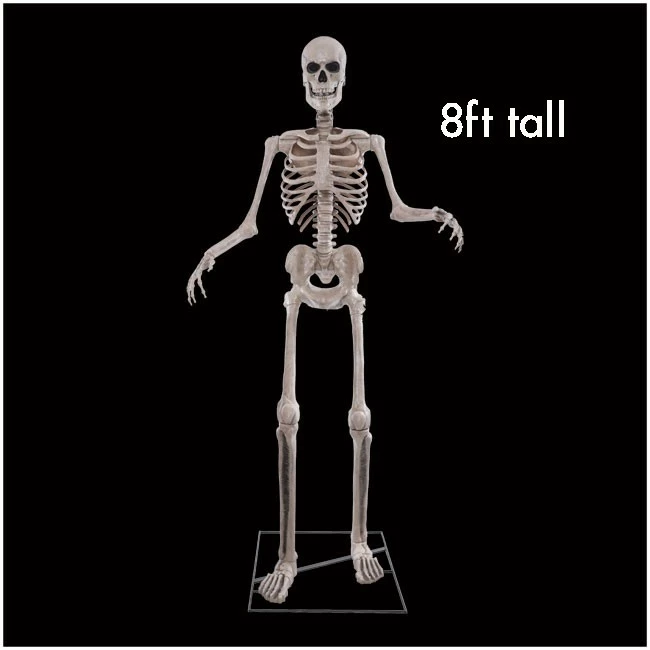 2.43m tall injection moulded poseable skeleton with realistic light up digiteyes; moving mouth and sounds. Arms are also poseable.