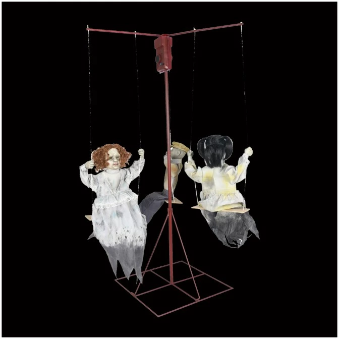 Prop includes red iron frame merry-go-round with three swings and three dolls dressed in distressed Victorian era clothing with cracked faces. Add this animated prop to your indoor Halloween decorations to leave a haunting impression