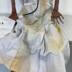Life size skeleton hand ‘corpsed’ and painted to give it a decayed appearance. She is dressed in a nurse’s univform and hat and wears a stethescope and watch.