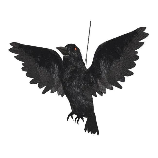 This lightweight Animated Crow has its wings outstretched and is ready to spread an eerie feeling to your visitors! The crow has a hanging loop for suspending from your display. Faux Fur and Fabric covering gives the appearance of feathers. You can hang this 11-inch long bird by itself or order a group to feature a whole murder of crows in your Halloween display. Sound Activated animation includes Light-Up Eyes, Flapping Wings, and the sound of Cawing, along with other spooky background sounds. Wings and feet are poseable. A Fine addition to your next haunted scene!