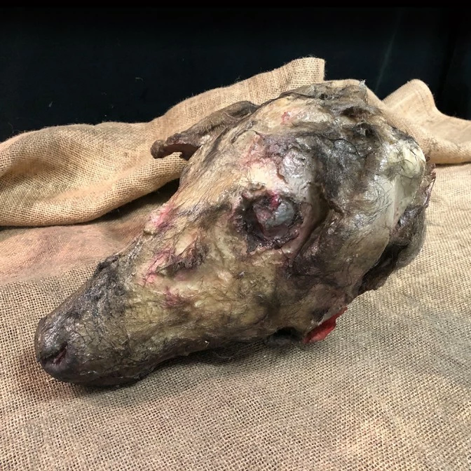This highly detailed rotting deer head is pretty disgusting. It has a thick latex skin and is filled with poly-foam. The dirty matted fur is a particularly lovely detail!