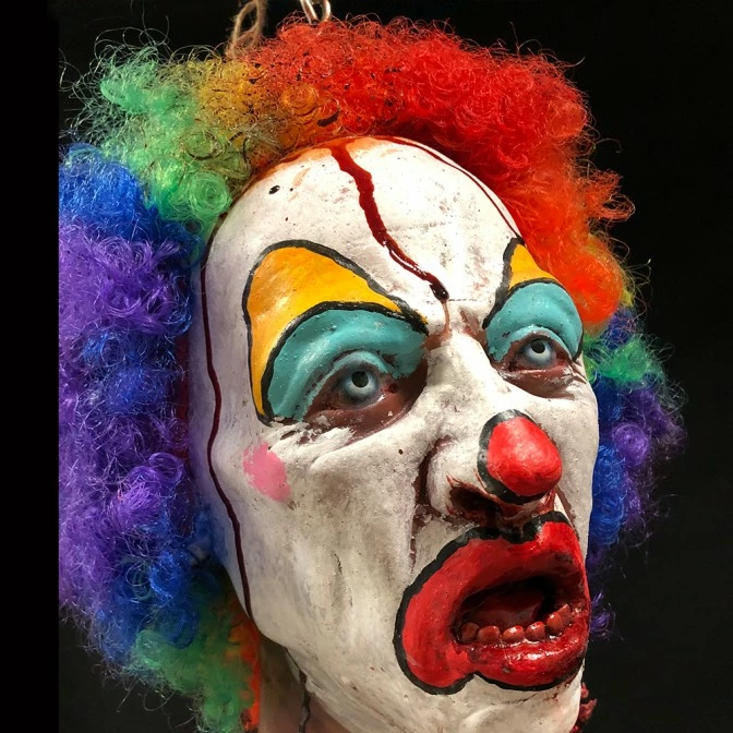 Straight from the US and hand-sculpted by a talented horror artist, we bring you this incredibly realistic severed clown head hanging on a bloody hook. This nasty prop will add a great visual to a decrepit circus attraction.