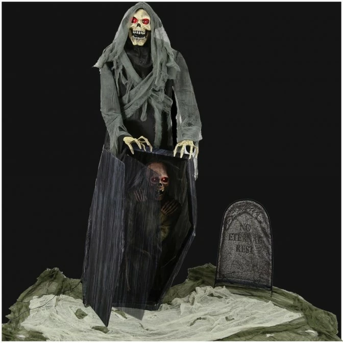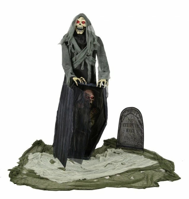 A piece of green gauze ground cover completes the scene. Once activate, the Graveyard Reaper will open the coffin door to show the doomed corpse inside and his mouth moves while saying one of three evilphrases: