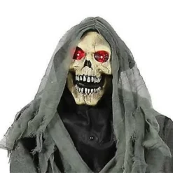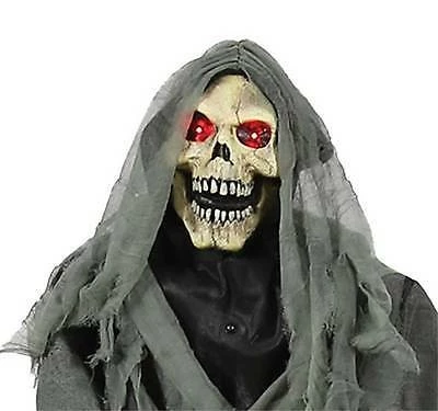 The Graveyard Reaper Halloween decoration set comes complete with a 5ft 9in Reaper character featuring a soft PVC head with a moving mouth and light-up eyes, a tattered costume with gauze details and blow-moulded hands. He stands next to a fabric wire-framed tombstone and a fabric-covered wire-framed 36 in-tall coffin that lights up and shows a rotting corpse inside.