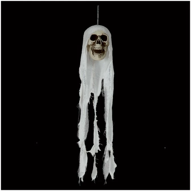 This creepy skull has hanging rags to give it an extra spooky feel. Hangs 70cm in total.