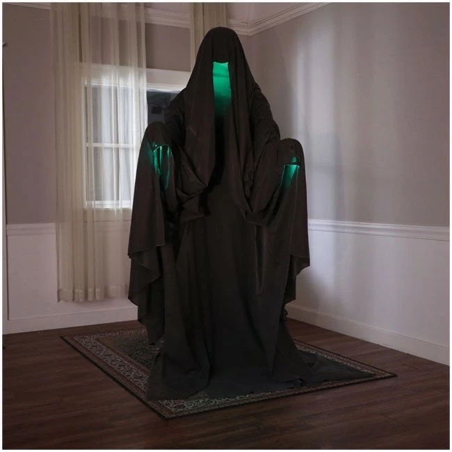 - Glowing green LED light emerges from an empty hooded head and hollow sleeves