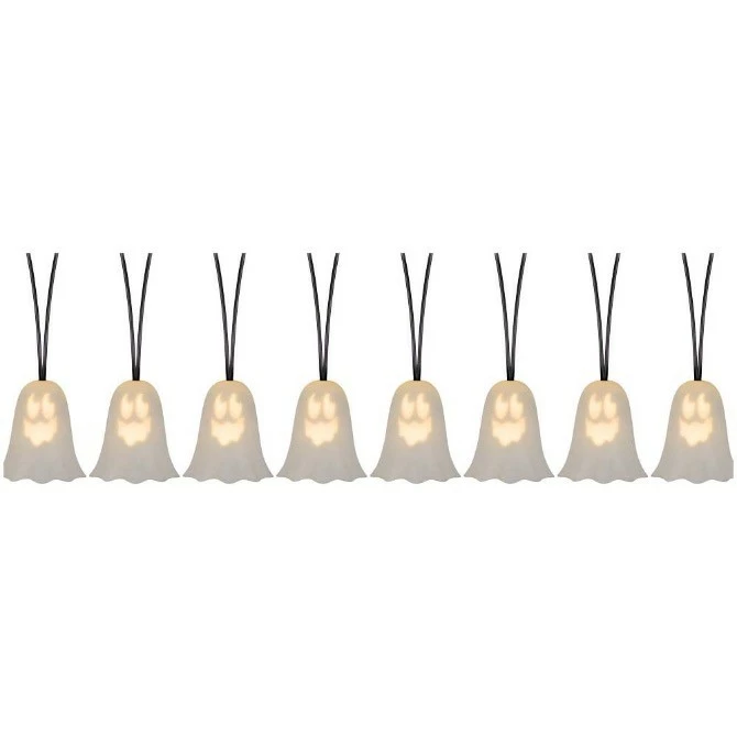 Battery-operated string of 8 Ghosts requires 3 AA Batteries, with a Try Me Button on the window display box.