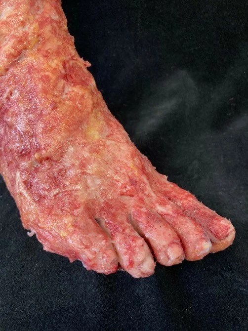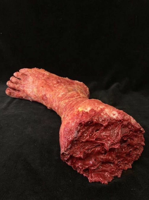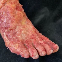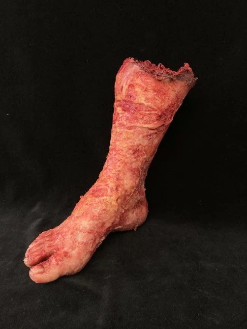 Life cast human severed foot in a ‘noxious’ finish. The perfect prop for your zombie apocalypse scene or future dystopia themed attraction.