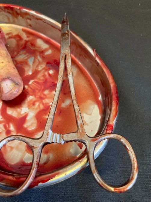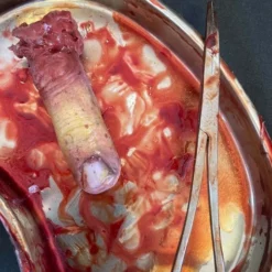 Life cast severed finger which has been freshly wrenched off the victim and placed on a surgical tray. Comes with bloody surgical instrument.