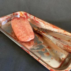 Life cast severed finger which has been freshly wrenched out of the victim’s mouth and placed on a surgical tray. Comes with the offendig bloody surgical instrument.