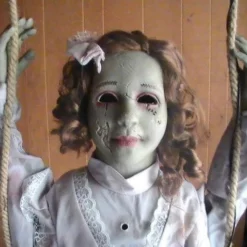 This spooky doll speaks haunting phrases to all passersby as her head turns side-to-side while she swings back and forth on her swing. Will look great in a porch or hanging from a tree (must be protected from the elements).