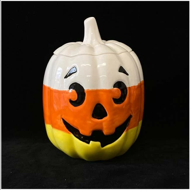 Cute ceramic pumpkin cookie jar in our own exclusive candy corn design. Wonderful quality and perfect for your Halloween home decor.
