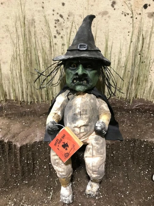 The doll has a soft ‘bean-bag’ style body with hand-scuplted limbs and heads. With a witch’s face reminiscent of the Halloween 3 mask and a trick or treat bag, this doll is freakily adorable.
