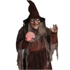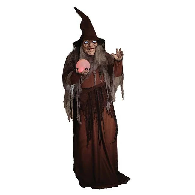 Your future unravels in the hands of a decrepit old 68-inch Digiteye Soothsayer Witch Animated Prop with dark inclinations. She grasps a mystical color-changing crystal ball, enticing spirits to draw close.