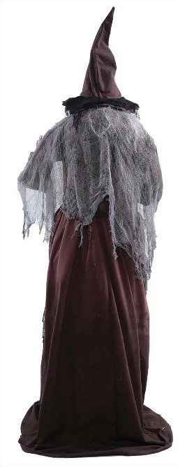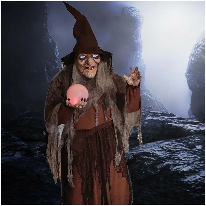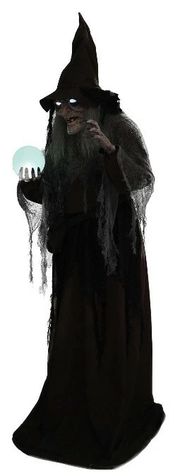 Her Head Turns side to side and her Luminous Digiteyes (a patented technology) spring to life when you enter her proximity, while her hand waves back and forth. A Ragged tattered Shawl is draped around the shoulders of the crone’s aging long brown robe. Gnarly teeth protrude from the Soothsayer’s Moving Mouth as she recounts one of Five discomforting Phrases: