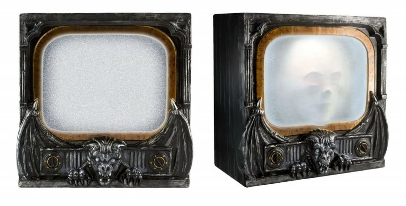 Tune in to Terror! When Activated, This Gothic Television Lights Up and Flickers with Static Sounds as a Terrifying Poltergeist Emerges From the Screen.