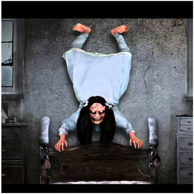 One of our most creepy Halloween props! This super creepy animated wall hanging possessed girl decoration can be hung on the wall for maximum spookiness. Imagine this above your bed!!!